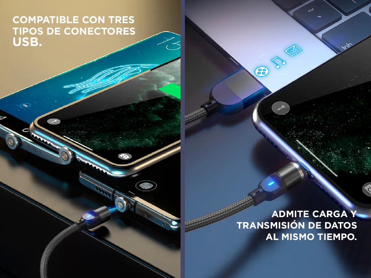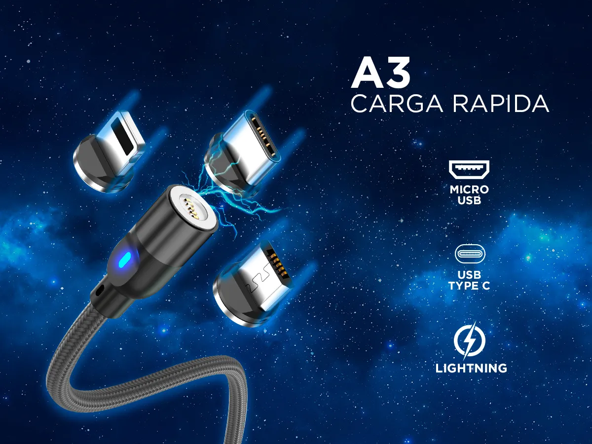 El cable magnético 3 en 1 te permite cargar y transferir datos de forma rápida, segura y sin desgaste en el puerto de tu celular.